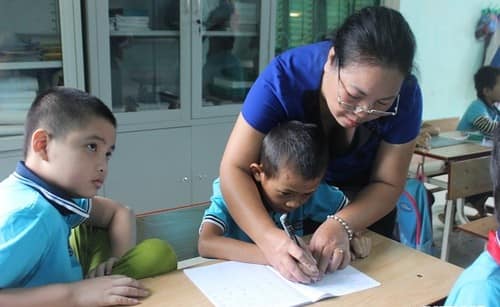 | Cô giáo Nguyễn Thị Hội tận tình uốn nắn, chỉ bảo từng nét chữ và bài tập cho học sinh khuyết tật tại lớp học của mình. |
