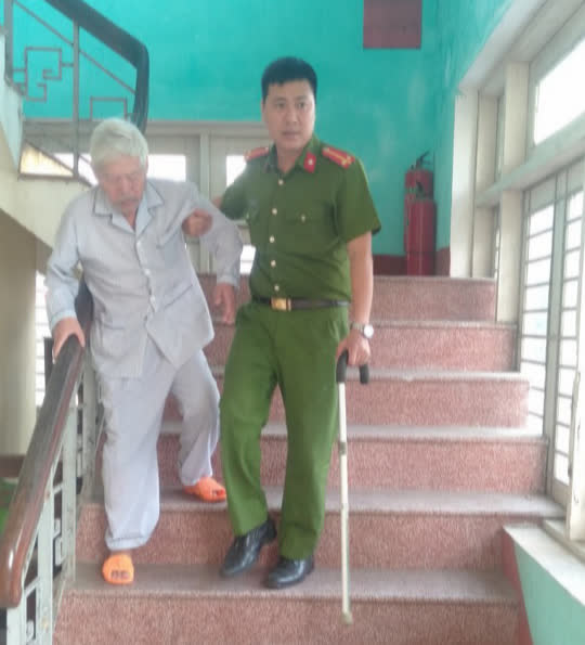 Trung úy Trần Văn Cói, Công an phường Tây Lộc đỡ một cụ già đi xuống tầng một sau khi làm căn cước công dân.