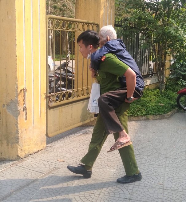 Công an phường Tây Lộc, TP Huế cõng một cụ già ra xe sau khi hoàn tất làm căn cước công dân.