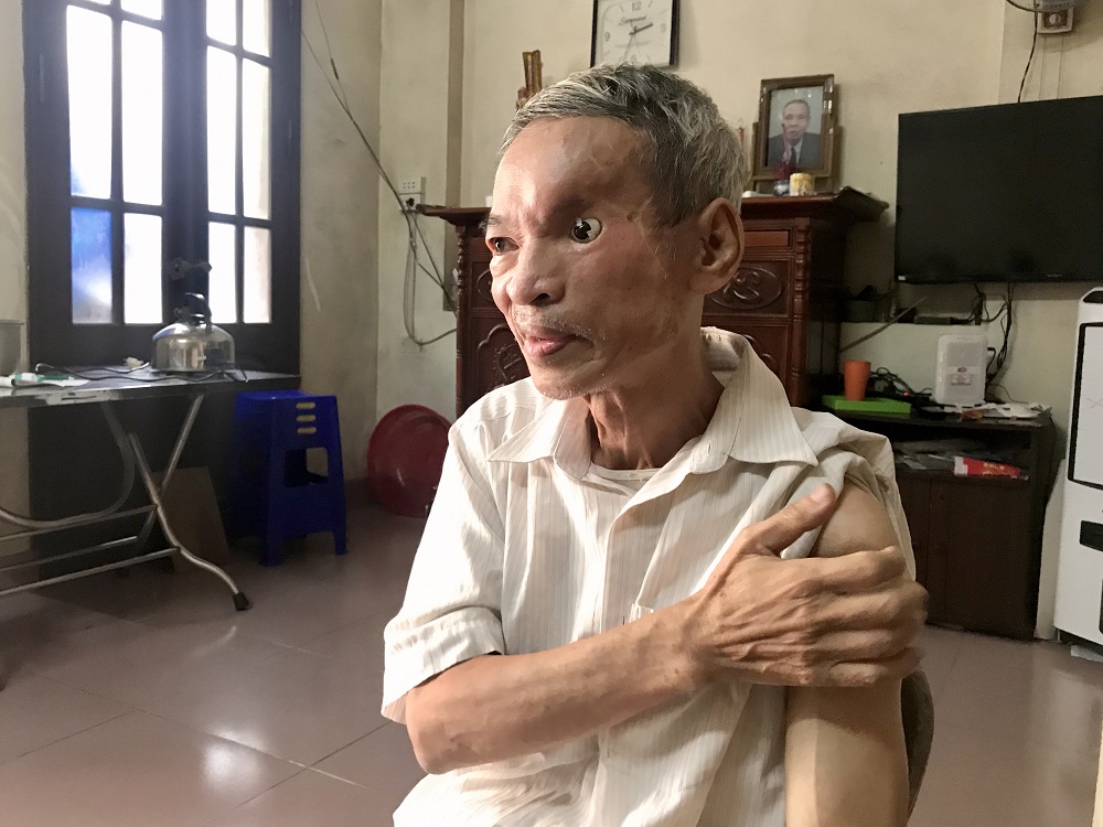 Dù một nửa bên mặt của ông Liệu bị biến dạng, nhưng, điều khiến chúng tôi ngạc nhiên hơn cả là hai miếng băng dính được dán bên trong mắt trái. Dường như đọc được những băn khoăn của chúng tôi, ông Liệu cười hóm hỉnh: “Đây là mắt giả được bác sĩ cấy ghép, mắt thật của tôi “ra đi” từ thời chiến tranh rồi. Do mí mắt teo lại nên mắt giả bị lồi, tôi phải dán băng dính để tránh mắt bị bong ra”.