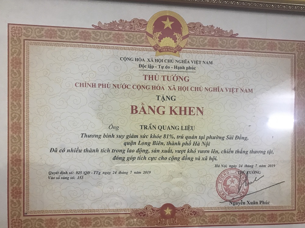 Một trong số những tấm bằng khen mà ông Liệu nhận được.