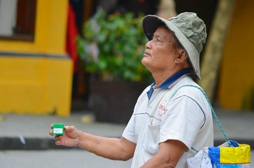 | Ông Định chống nạng khập khiễng đi rao bán dầu xoa cho khách du lịch tại TP Hội An. Ảnh: Quang Nam |