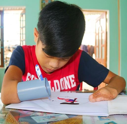 | Hiếu bị mìn nổ cụt hai tay, người chị đã nghĩ ra cách làm một ống nhựa đặt vào mỏm tay cụt cho em tập viết. Ảnh: Quang Nam |