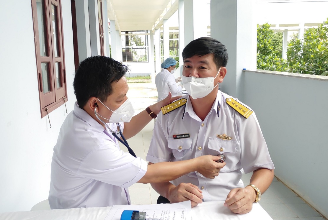 Trước khi tiêm chủng, các các bộ chiến sĩ sẽ được kiểm tra sức khỏe (đo thân nhiệt, đo huyết áp, nhịp tim...). Đại tá Nguyễn Quốc Doanh - Phó Tư lệnh Vùng 5 Hải quân (bên phải) tham gia tiêm chủng vaccine phòng COVID-19.