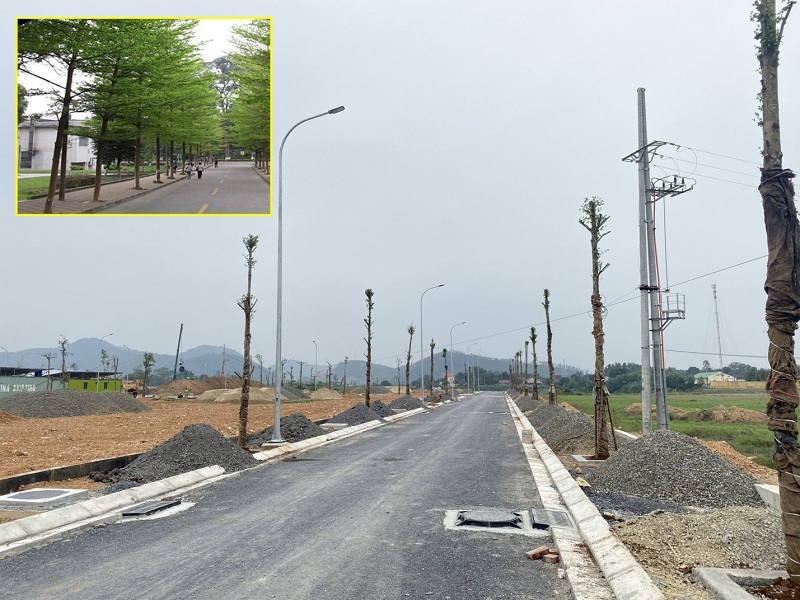 Chủ đầu tư đang tiến hành lát vỉa hè và trồng cây xanh hai bên đường. Cây bàng đài loan, cây phương vĩ, cây bằng lăng... được lựa chọn để phủ xanh dự án.