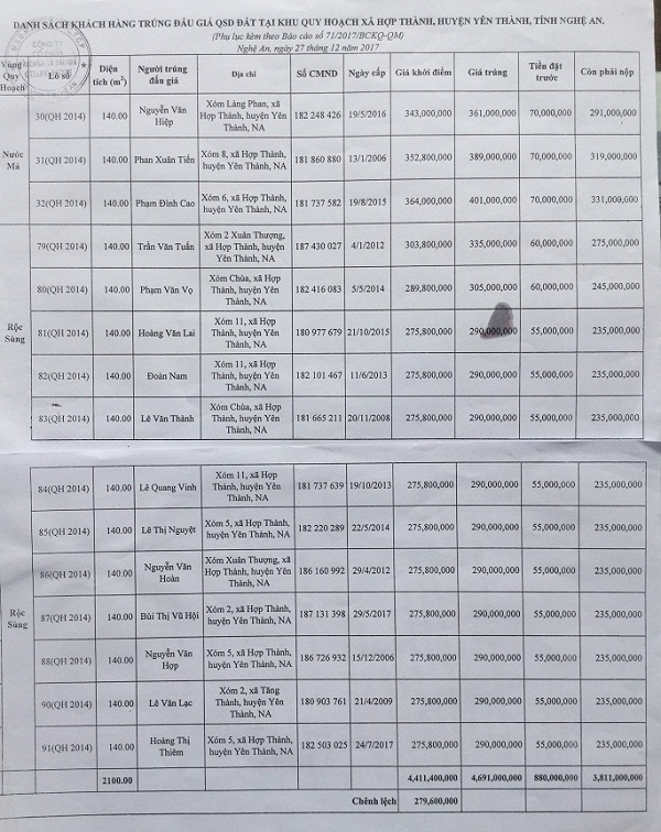 Tại phiên đấu giá 15/17 lô đất ở khu quy hoạch Nước Má và Rộc Sùng (xã Hợp Thành) ngày 26/12/2017, Công ty Tài chính và đấu giá Quang Minh cũng được UBND huyện Yên Thành ký hợp đồng cho phép thực hiện. Qua đấu giá, sự chênh lệch giá trúng đấu giá giữa các lô đất có diện tích 140m2 ở cùng khu quy hoạch khá cao. Ví dụ: Tại khu quy hoạch Nước Má, lô số 30 có giá đấu cao nhất là 361 triệu đồng, nhưng lô số 32 mức giá trúng đấu giá là 401 triệu đồng. Ngược lại, 12 lô đất tại khu quy hoạch Rộc Sùng cũng có diện tích tương tự nhưng lô số 79 được “đấu” tới mức giá 335 triệu đồng, lô số 80 người trúng đấu giá ở mức 305 triệu đồng, trong khi đó có tới 10 lô bị “dìm” chỉ ở mức giá trúng là 290 triệu đồng.