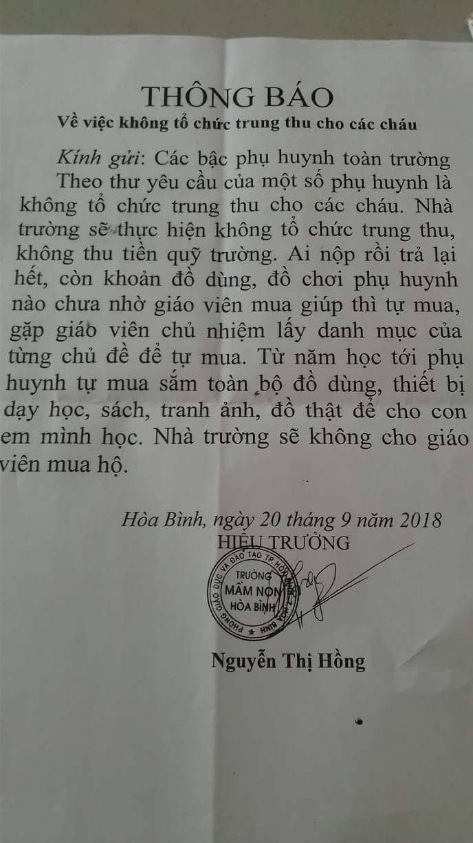 Qua tìm hiểu, phóng viên được biết. sáng ngày 20/9/2018, cô giáo Nguyễn Thị Hồng, Hiệu trưởng Trường mầm non Hòa Bình đã ký 1 tờ giấy thông báo như tờ rao vặt, dán ở bảng tin nhà trường nhằm hủy tết trung thu của trẻ nhỏ. Mà trước đó, Ban Giám hiệu nhà trường đã có kế hoạch chỉ đạo giáo viên phổ biến và thu tiền tới các cha mẹ học sinh. Việc chỉ đạo thu tiền này là 1 số tiền lớn, khoảng 1,3 triệu đồng, gồm nhiều khoản đóng góp khác nhau như tiền mua đồ chơi, đồ dùng, thiết bị dạy học, sách, tranh ảnh… Cũng chính bởi khoản thu “sốc” nên nhiều người dân xã Hòa Bình, phần đa là bà con nghèo nên mọi người có ý kiến là đóng dần. Nhưng thay vì tiếp thu các góp ý của người dân nghèo thì Hiệu trưởng Nhà trường đã ngang nhiên “đáp trả” lại phụ huynh học sinh bằng cách “cắt tết”.