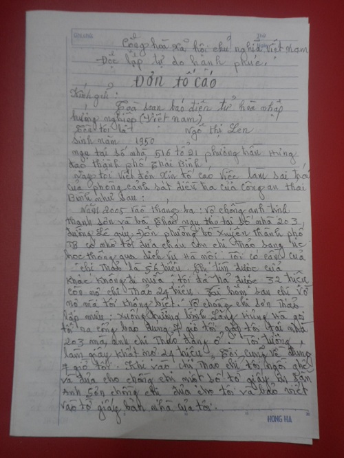 | Đơn tố cáo Phòng Cảnh sát điều tra Công an tỉnh Thái Bình của bà Ngô Thị Len gửi Tạp chí Điện tử Hòa Nhập |