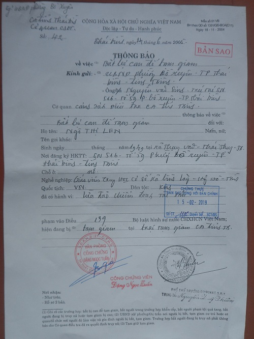 Điều đáng nói là Phòng Cảnh sát điều tra Công an tỉnh Thái Bình thực hiện bắt người, khám nhà vào đêm 23/6/2005 nhưng đến ngày 24/6/2005 mới có bản Thông báo số 42 về việc bắt bị can Ngô Thị Len đã có hành vi lừa đảo chiếm đoạt tài sản để tạm giam do Trung tá Nguyễn Duy Phiên, Phó Thủ trưởng cơ quan CSĐT Công an tỉnh Thái Bình ký tên???