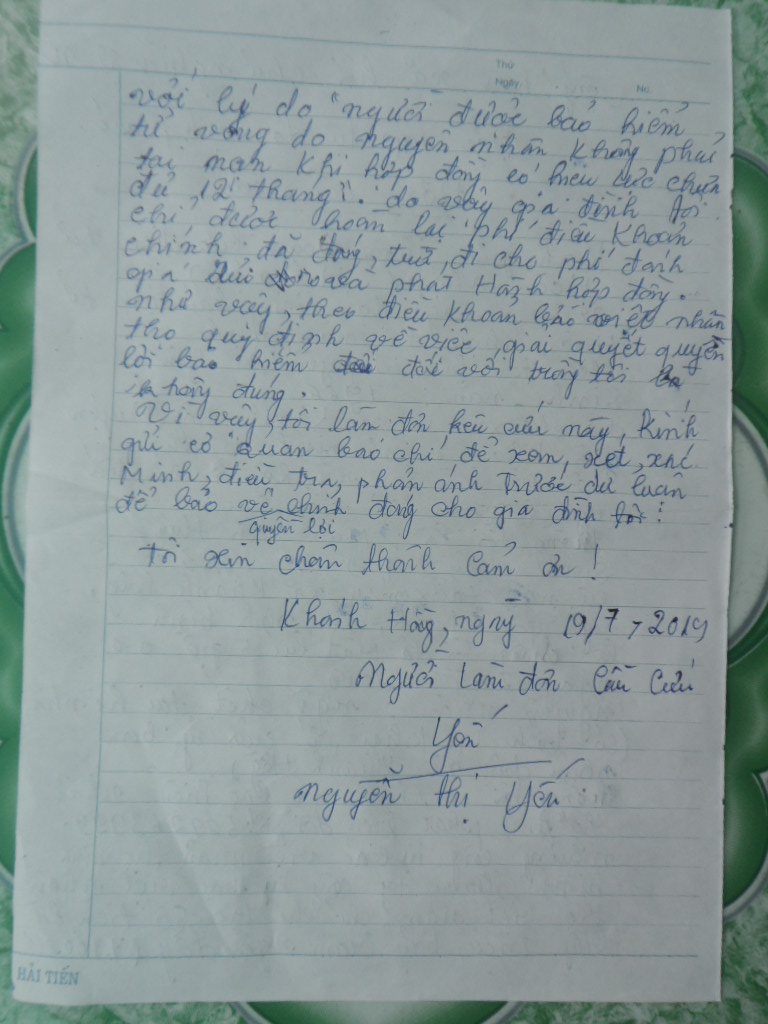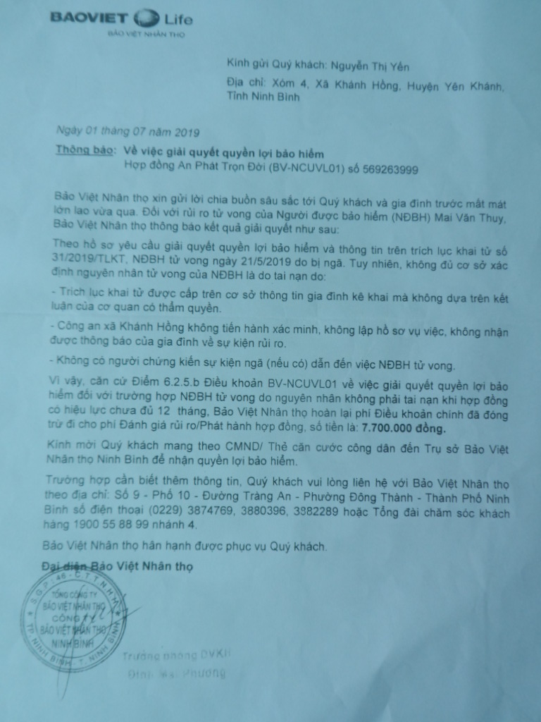 Điều đáng nói là sau khi hoàn tất hồ sơ yêu cầu giải quyết quyền lợi bảo hiểm, Bảo Việt Nhân thọ Ninh Bình chỉ hoàn lại phí Điều khoản chính đã đóng, trừ đi phí đánh giá rủi ro, phát hành hợp đồng nên số tiền bà Yến còn được nhận là 7.700.000 đồng. Trong khi đó, trường hợp người được bảo hiểm tử vong do tai nạn khác vẫn được Bảo Việt Nhân thọ giải quyết quyền lợi bảo hiểm với số tiền lớn hơn rất nhiều. Lý do được nêu trong thông báo của Bảo Việt Nhân thọ Ninh Bình là không đủ cơ sở xác định nguyên nhân ông Mai Văn Thuy tử vong do tai nạn. Cụ thể là trích lục khai tử được cấp dựa trên thông tin gia đình kê khai, công an xã không tiến hành xác minh, không lập hồ sơ vụ việc… nên chỉ hoàn lại phí đã đóng. Vì vậy, bà Yến mới bức xúc làm đơn kêu cứu gửi đến cơ quan chức năng để xem xét, xác minh, giải quyết thỏa đáng cho gia đình bà.
