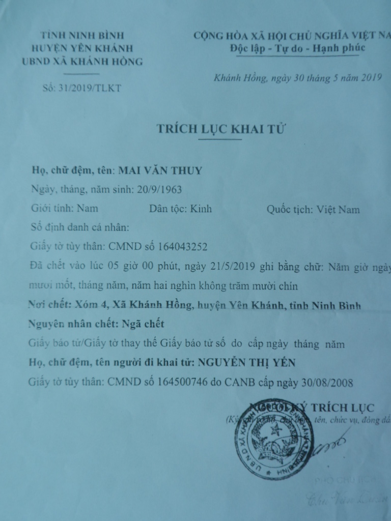| Trích lục khai tử của UBND xã Khánh Hồng, huyện Yên Khánh, tỉnh Ninh Bình. |