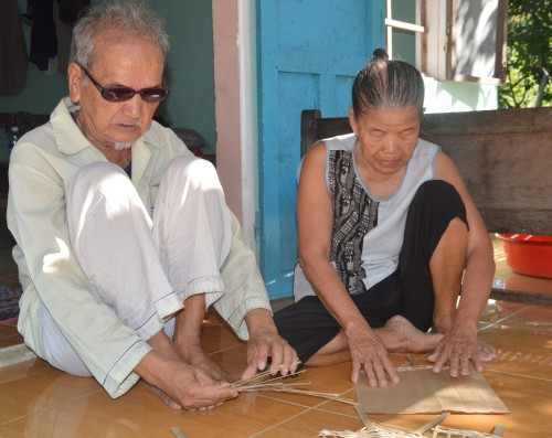 Trong căn nhà cấp bốn rợp bóng cây xanh, êm đềm nghe tiếng chim ca ngày ngày này, có một đôi vợ chồng đã ở cái tuổi bóng xế là ông Bùi Xuân Hồng (79 tuổi) và bà Trương Thị Dưỡng (71 tuổi, phường Sơn Phong, TP.Hội An) vẫn coi việc đùm bọc, cưu mang những mảnh đời khốn khó không nơi nương tựa, hay những người đồng cảnh mù lòa với mình là niềm vui sống mỗi ngày. Nở nụ cười hiền đón khách khi trên tay, ông Hồng vẫn đang tỉ mẩn bện từng sợi dây làm chiếc quạt tre để mang ra chợ bán, còn bà đang dán từng tờ giấy làm thành chiếc quạt nhỏ xing. Tạm gác lại công việc đang dở dang, ông bà đến bên chiếc bàn để ở trước sân nhà rót nước mời khách rồi chậm rãi kể về câu chuyện của cuộc đời mình.
