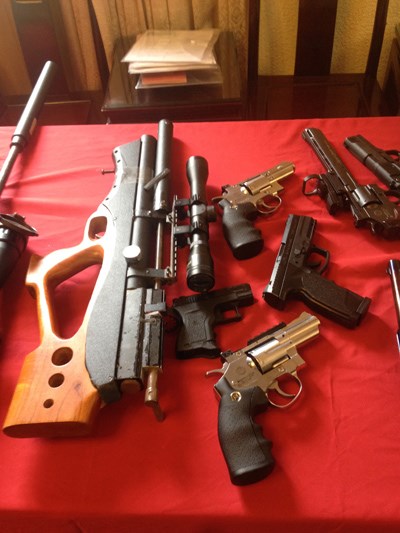 Căn phòng hình tam giác đã được Vũ Quang Hùng khéo léo thiết kế ngăn lại phần cuối cùng của góc nhọn nhất để cất giấu cả kho vũ khí. Cơ quan công an đã thu giữ 11 khẩu súng (3 khẩu súng dài có ống ngắm, 8 khẩu súng ngắn), hàng nghìn viên đạn các loại cùng 26 bình khí còn nguyên vẹn; 9 dao, 6 kiếm, 1 rìu, 2 dùi cui bằng nhựa, 1 nỏ bắn tên, 1 túi nilon chứa 1,368 gam ma túy tổng hợp; 11,740 gam chất dẻo màu nâu đen; 438 giấy tờ liên quan việc cho vay nợ (với tổng số tiền khoảng 4,8 tỷ đồng); 43 chứng minh nhân dân; 17 sổ hộ khẩu; 6 hộ chiếu cùng một số tài sản, đồ vật khác.