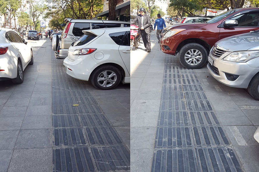 Tuyến đường Yết Kiêu (Hà Nội) được đầu tư tốn kém để làm đường dành cho người khiếm thị nhưng lại bị các xe ô tô chiếm dụng làm nơi đỗ xe. Ảnh: báo Hà Nội mới