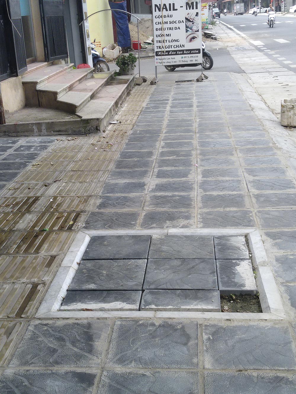 Tại đường Quang Trung, thị trấn Thắng (Hiệp Hòa) cũng đang được sửa sang và có lối đi dành cho xe lăn. Tuy nhiên, tại nhiều điểm, lối đi này không được bố trí xây dựng một cách đồng bộ, làm ảnh hưởng đến mỹ quan đô thị. Trong quá trình thi công lát gạch vỉa hè, đã xuất hiện những vấn đề bất cập như lối đi dành riêng cho người sử dụng xe lăn lại đâm thẳng vào cột điện, gạch vàng được lát dưới bậc thềm nhà dân, bậc thềm nhô ra lấn đường. Điều này cho thấy thiếu sự phối hợp giữa đơn vị thi công và đơn vị thiết kế, làm mất mỹ quan đô thị cũng như không phát huy đúng mục đích của việc xây dựng làn đường.