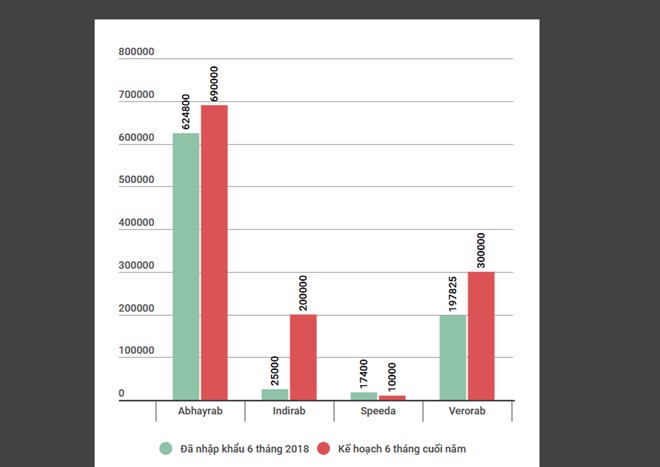 Cụ thể, vắcxin Abhayrab, số lượng đã nhập khẩu trong 6 tháng đầu năm 624.800 liều, kế hoạch cung ứng 6 tháng cuối năm 690.000 liều.