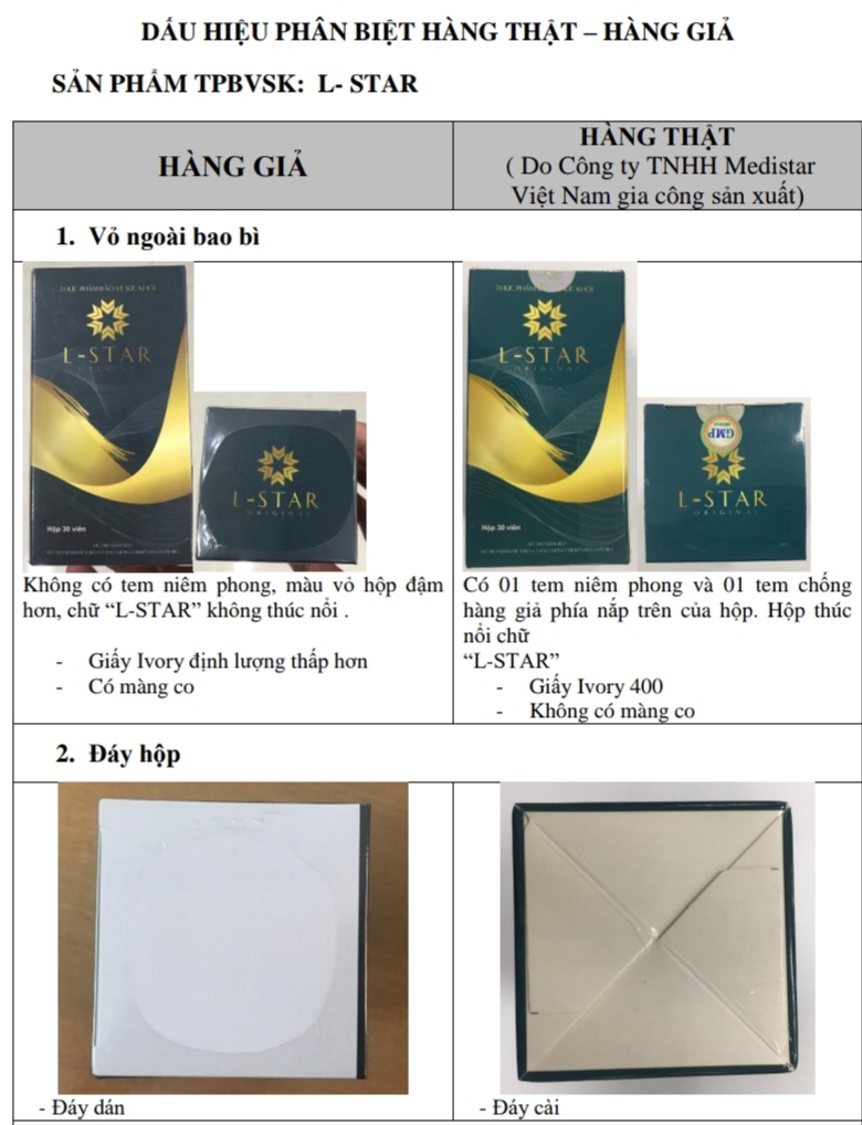 Sản phẩm có đặt điểm: không dán tem Medistar tại đầu hộp, hoặc sản phẩm dán tem giả mạo tem của Medistar, thông tin số lô không đúng với lô hàng do Medistar sản xuất (LSX: Số 1, NSX: 12/2019, HSD: 12/2022), sao chép mẫu mã, kiểu dáng bao bì, nhãn hiệu hàng hóa “L - Star”. Giữa hàng giả, không chính hiệu nêu trên và lô hàng thật do Medistar sản xuất có rất nhiều sự khác biệt từ bên ngoài nhãn tới chai lọ, bột viên…”.
