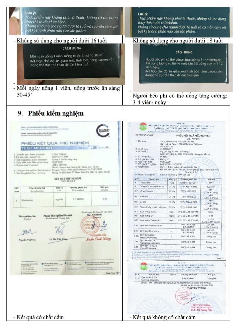 Theo Giấy tiếp nhận đăng ký bản công bố sản phẩm số 13050/2019/ĐKSP ngày 30/11/2019, sản phẩm thực phẩm bảo vệ sức khỏe L-STAR do Công ty Trách nhiệm hữu hạn Health star có địa chỉ: 228 Lệ Ninh kéo dài, phường Quán Bàu, thành phố Vinh, tỉnh Nghệ An công bố, Công ty TNHH Medistar Việt Nam – Nhà máy số 1, địa chỉ: Lô 38-2, Khu Công nghiệp Quang Minh, huyện Mê Linh, Thành phố Hà Nội sản xuất). Theo công văn của Công ty TNHH Medistar Việt Nam: Công ty TNHH Medistar Việt Nam đã sản xuất cho Công ty Trách nhiệm hữu hạn Health star lô sản phẩm thực phẩm bảo vệ sức khỏe L-STAR (LSX 010120, NSX: 02/01/2020, HSD 01/01/2023); Quy cách hàng hóa khi chuyển giao cho Công ty Trách nhiệm hữu hạn Health star: Hộp chứa chai nhựa PET nắp chống trẻ em, hộp 30 viên / lọ, nắp nhựa chống trẻ em, túi chống ẩm, màng seal. Hộp giấy Ivory 400 cán bóng thúc nổi tên sản phẩm 2 mặt chính; tại đầu mỗi hộp sản phẩm được dán 01 tem niêm phong và 01 tem chống hàng giả của Medistar, hàng đóng nguyên thùng, mỗi thùng dán nhãn hàng hóa của Medistar.