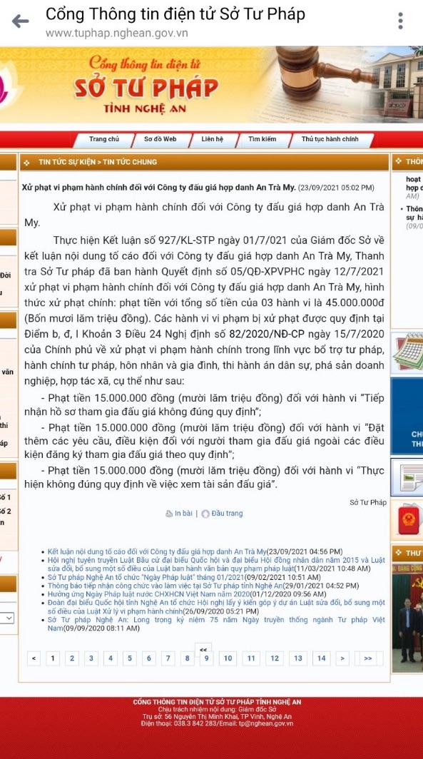Sở Tư pháp Nghệ An đăng tải thông tin xử phạt vi phạm hành chính với Công ty đấu giá hợp danh An Trà My. Ảnh chụp màn hình trên tuphap.nghean.gov.vn