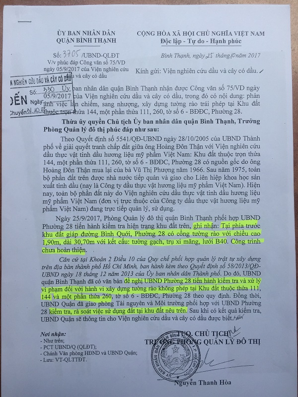 Ngay khi xảy ra tình trạng có một số hộ dân lấn, chiếm đất, mua bán, sang nhượng trái phép tại số 1032 (nay là số 498) Xô Viết Nghệ Tĩnh, phường 28, quận Bình Thạnh, do Viện NCD&CCD đang quản lý, ngày 5/9/2017, Viện đã có văn bản số 75/VD gửi UBND quận Bình Thạnh, có nội dung: Viện NCD&CCD thuộc Bộ Công thương, được UBND TP.Hồ Chí Minh giao và quản lý khu đất 4,9 ha để trồng dừa thực nghiệm tại 498 (1032B) Xô Viết Nghệ Tĩnh, phường 28, quận Bình thạnh, TP.HCM theo Thông báo số 70/TB-UB ngày 29/5/1991. Trước đây, ngày 20/5/2009, Viện đã có đơn đề nghị UBND phường 28, quận Bình Thạnh xác nhận địa chỉ và diện tích bị lấn chiếm tại các thửa 111, 260, 291, 144,40, 298, 290 theo bản đồ số 131/TTĐK-KT ngày 20/5/2005 của Sở Tài nguyên và Môi trường (TNMT) thành phố. Tuy nhiên, tình hình vi phạm đất đai tại đây có lắng dịu nhưng sau đó lại tái diễn ngày càng nghiêm trọng. Cụ thể là ngày 3/9/2017, lợi dụng ngày nghỉ lễ Quốc khánh 2/9, một số hộ dân đã tập kết vật tư, xây tường rào gạch kiên cố trái phép mặt tiền đường tại khu đất số 498 Xô Viết Nghệ Tĩnh, phường 28, quận Bình Thạnh. Nhận thấy việc các hộ dân ngang nhiên lấn chiếm đất đai và xây dựng trái phép, là hành vi rất nghiêm trọng, làm ảnh hưởng đến việc quản lý và khai thác khu đất của Viện NCD&CCD theo Thông báo số 70/TB-UB ngày 29/5/1991 của UBND TP.HCM. Sau khi vụ việc xảy ra, Viện NCD&CCD đã cử cán bộ đến làm việc với Thường trực UBND phường 28 quận Bình Thạnh, đề nghị chính quyền địa phương có biện pháp xử lý, ngăn chặn không để tình hình lấn chiếm, xây dựng trái phép trên khu đất Viện đang quản lý. Đại diện UBND phường đã ghi nhận sự việc, báo cáo lãnh đạo phường đồng thời sẽ trình bày nội dung vụ việc vào cuộc họp giao ban ngày 5/9/2017. Sau khi tiếp nhận đơn của Viện NCD&CCD, Phòng Quản lý đô thị quận Bình Thạnh phối hợp UBND phường 28 kiểm tra hiện trạng khu đất trên, ghi nhận: Tại phía trước khu đất giáp đường Bình Qưới, phường 28 có cổng tường rào với chiều cao 1,90m, dài 30,70m, với kết cấu tường gạch, trụ xi măng, lưới B40. Căn cứ Quy chế phối hợp quản lý trật tự xây dựng trên địa bàn TP.HCM, UBND quận Bình Thạnh đã đề nghị UBND phường 28 tiến hành kiểm tra và xử lý vi phạm đối với hành vi xây dựng tường rào không phép tại khu đất thuộc thửa 111, 144 và một phần thửa 260, tờ số 6-BĐĐC phường 28 theo quy định. UBND quận giao Phòng TNMT phối hợp với UBND phường 28 kiểm tra, rà soát việc sử dụng đất tại khu vực trên. Sau khi có kết quả kiểm tra, UBND quận sẽ thông tin cho Viện NCD&CCD được biết. Từ đó đến nay đã hơn 1 năm nhưng vẫn chưa nhận được hồi âm từ UBND phường 28 và UBND quận Bình Thạnh.