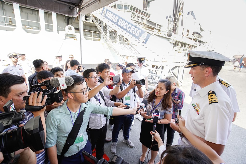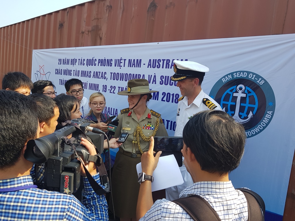 | Tùy viên Quốc phòng Úc Đại tá Nerolie McDonald và Chỉ huy tàu HMAS Anzac trả lời pv báo chí địa phương |