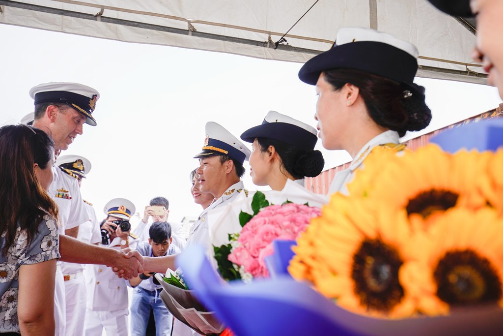 | Đại diện Hải quân Việt Nam đón và tặng hoa 3 chỉ huy tàu và thủy thủ đoàn |