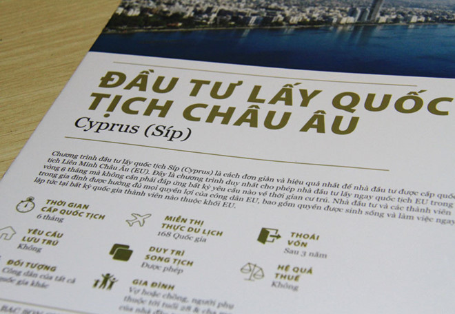 Ông Lưu Minh Ngọc, Tổng giám đốc Công ty cho biết: “Chỉ cần bỏ ra số tiền tối thiểu 300.000 euro để mua bất động sản ở Cộng hòa Síp, nhà đầu tư sẽ được cấp thẻ xanh cho cả ba thế hệ (vợ, chồng, con, bố mẹ hai bên) được nhập tịch và trở thành cư dân châu Âu, duyệt hộ chiếu trong vòng 3 tháng, cấp quốc tịch trong vòng nửa năm”.
