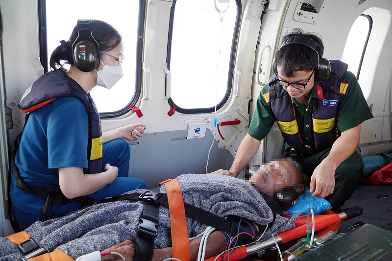 Thượng uý, bác sĩ Tạ Văn Bạch chia sẻ: “Trong quá trình vận chuyển về đất liền, bệnh nhân có tăng áp lực nội sọ nên đã gây ra rất nhiều khó khăn. Thứ nhất, thời gian vận chuyển từ đảo Song Tử Tây – đây là đảo có khoảng cách xa nhất thuộc Quần đảo Trường Sa về với đất liền, mất khoảng từ 4-5 giờ đồng hồ. Thứ hai, sau khi lên trực thăng, áp lực nội sọ sẽ tăng làm nặng thêm tình trạng bệnh nên chúng tôi cần phối hợp với tổ bay để bay thấp nhất có thể, do đó thời gian bay về càng chậm. Bệnh nhân có những thời điểm huyết áp rất cao, chúng tôi phải dùng phương pháp hạ áp bằng thuốc đường tĩnh mạch”.