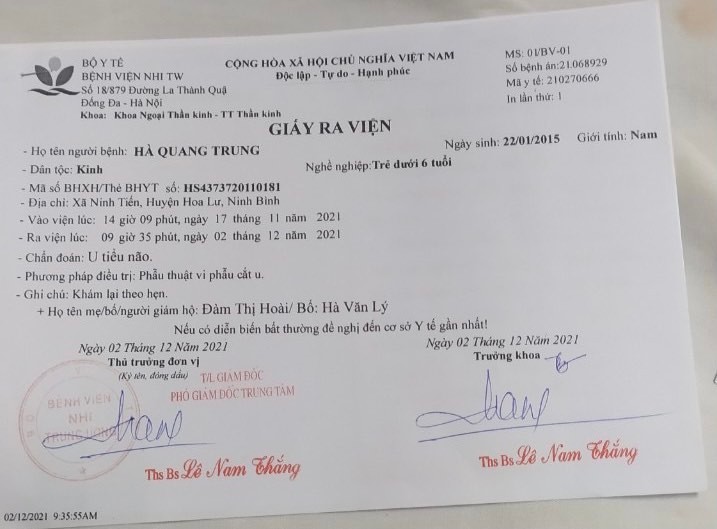 Bác sĩ cho biết, Quang Trung cần được phẫu thuật gấp, để lâu khối u tăng lên rất nhanh. Ngay lập tức, con được nhập viện Bệnh viện Nhi Trung ương. Trải qua cuộc đại phẫu nguy hiểm, chưa dừng lại ở đó, bác sĩ chỉ định Trung phải chuyển sang Bệnh viện 108 để tiến hành truyền hoá chất 8 đợt liên tục, hằng ngày kết hợp xạ trị. Cơ thể nhỏ bé, yếu ớt, xanh xao chưa kịp hồi phục đã liên tiếp gánh chịu những nỗi đau tột cùng.