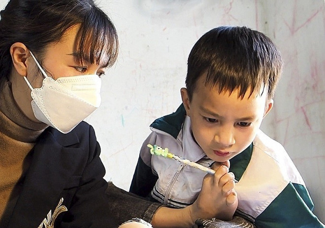Khải kể: “Quá trình học chữ rất mỏi chân và đau lưng, nhưng chưa bao giờ em thôi cố gắng vì đó là cách để em được đến trường gặp gỡ bạn bè”.