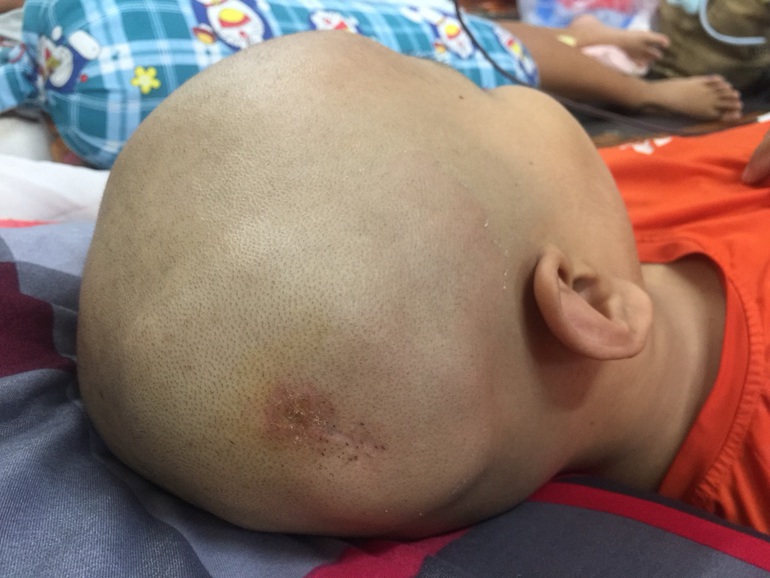 Khu vực đỉnh đầu của Phúc đang sưng to (Ảnh: Dân trí)