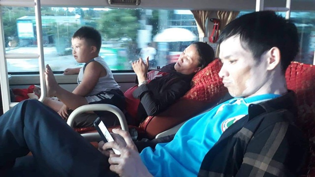 | Bé Hoàng và mẹ cùng nhà hảo tâm trên đường vào Huế để khám chữa bệnh từ chiều ngày 6/10. |