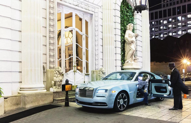 | Hai người đàn ông bên "người bạn đồng hành" Rolls-Royce Wraith. |