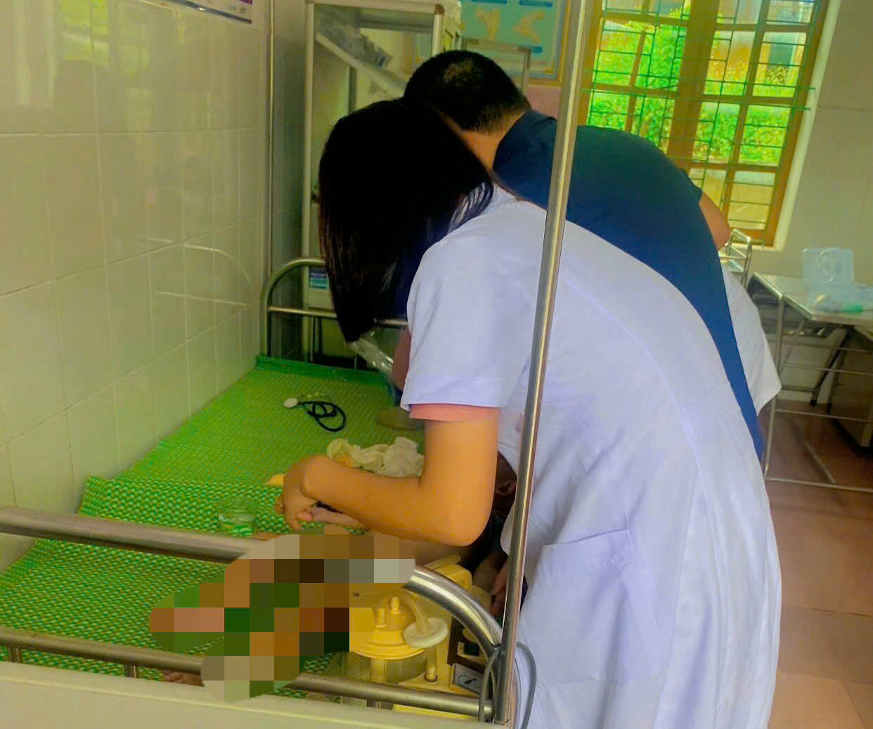 Bác sĩ Hậu (áo xanh) cùng đội ngũ y, bác sĩ trạm y tế xã Ngọc Lâm đang dành giật sự sống cho cháu bé