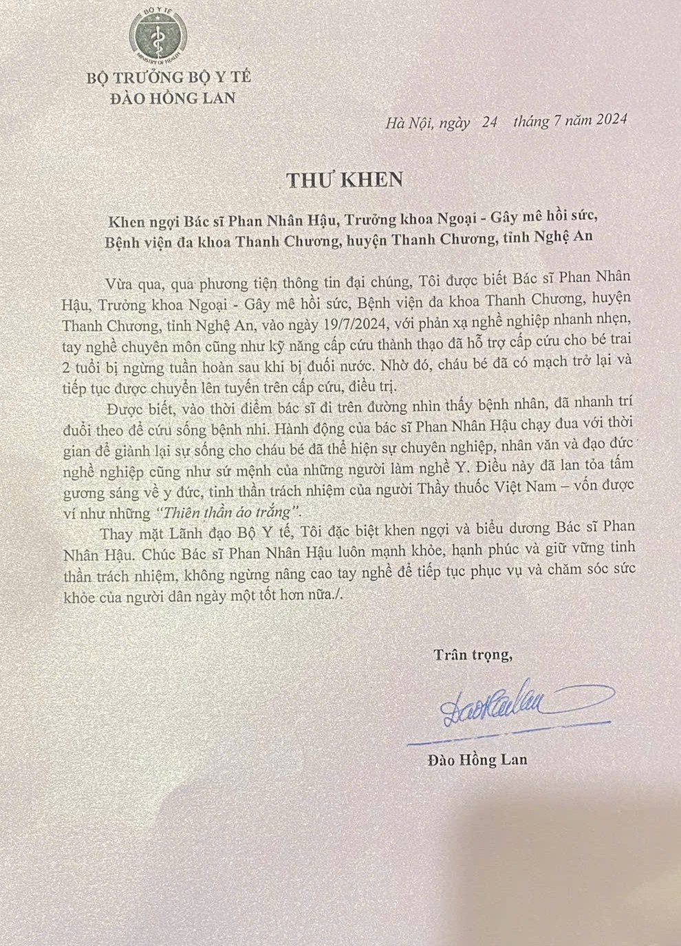 Thư khen của Bộ trưởng Bộ Y tế Đào Hồng Lan gửi tới bác sĩ Phan Nhân Hậu
