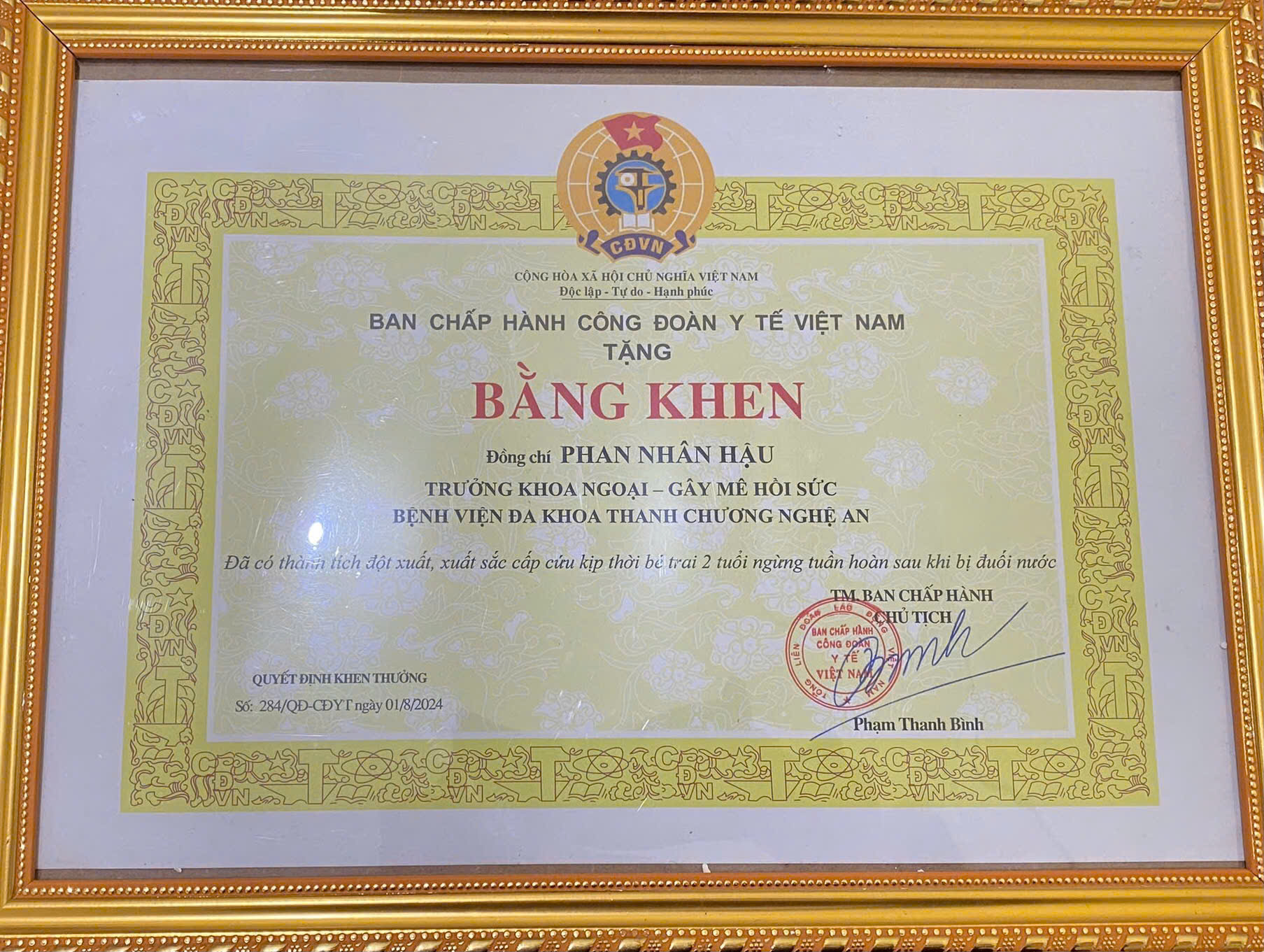 Ban chấp hành Công đoàn Y tế Việt Nam đã tặng bằng khen cho bác sĩ Phan Nhân Hậu vì hành động cấp cứu kịp thời bé trai 2 tuổi ngừng tuần hoàn khi bị đuối nước