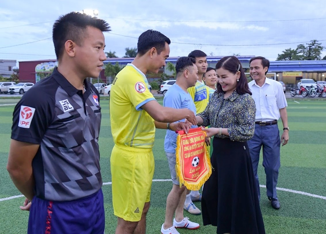 Bà Nguyễn Thị Thu Thủy - Bí thư Huyện ủy Trực Ninh trao cờ lưu niệm cho đại diện các đội bóng.
