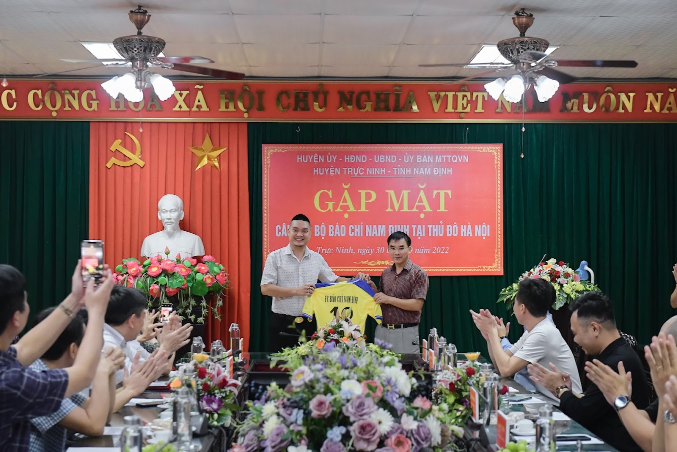 Lãnh đạo huyện Trực Ninh và đại diện CLB báo chí Nam Định trao tặng cờ lưu niệm, tặng hoa và chụp ảnh