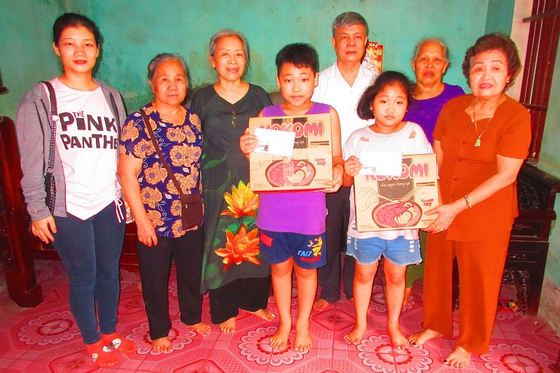 Ông Nguyễn Văn Ngọt, Chủ tịch Mặt trận Tổ quốc xã Dương Hà cùng đại diện tổ từ thiện CLB CCB liên các tỉnh, thành tới thăm gia đình và tặng quà cho cháu Nguyễn Thu Hà, Nguyễn Hà Đăng