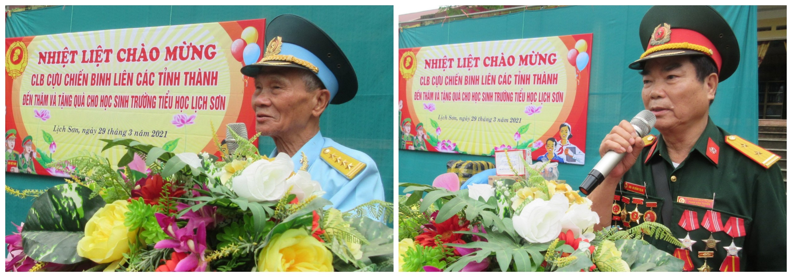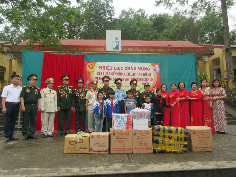 Tới thăm và tặng quà cho học sinh trường tiểu học Lịch Sơn, ông Phan Văn Tuyến, Phó Chủ tịch thường trực CLB phát biểu: “Hôm nay, vì nỗi nhớ, thương và tình yêu với các cháu, và tình cảm sâu sắc với nhà trường, CLB CCB đã đến thăm và tặng quà cho các cháu. Sau chiến thắng 30 tháng tư năm 1975, chúng tôi là những người chiến sĩ cách mạng, đã chắc tay súng lại chắc tay cày, trở về địa phương với cuộc sống đời thường. Mặc dù tuổi cao sức yếu, trong người mang nhiều thương tật, bệnh tật, vì tình thương đồng chí, đồng bào, chúng tôi đã thành lập CLB CCB liên các tỉnh thành để đi thắp lễ tri ân, để đi đền ơn đáp nghĩa và tặng quà cho các gia đình chính sách, cho các địa phương nghèo khó, cho các đồng chí cán bộ, công an nơi biên giới hải đảo có nhiều khó khăn. 10 năm nay chúng tôi đã đi khắp hai miền Nam Bắc, từ Mục Nam Quan đến Mũi Cà Mau, từ đồng bằng đến miền núi và biển đảo xa xôi, biên cương của tổ quốc tặng quà cho các gia đình chính sách, cho các cháu học sinh nghèo khó, và thắp lễ tri ân các đồng đội của mình. Đoàn đi đến đâu cũng được Đảng, chính quyền, các đoàn thể và nhân dân đón tiếp nhiệt thành như người anh em ruột thịt. Và hôm nay, chúng tôi đến đây tặng quà và thăm trường của chúng ta. Mặc dù, đường xá xa xôi, tuổi cao sức yếu, nhưng các đồng chí cán bộ, hội viên và người thân chiến sĩ đã vượt qua nhiều khó khăn về với trường tiểu học Lịch Sơn để thăm và tặng quà cho học sinh trong nhà trường…”.