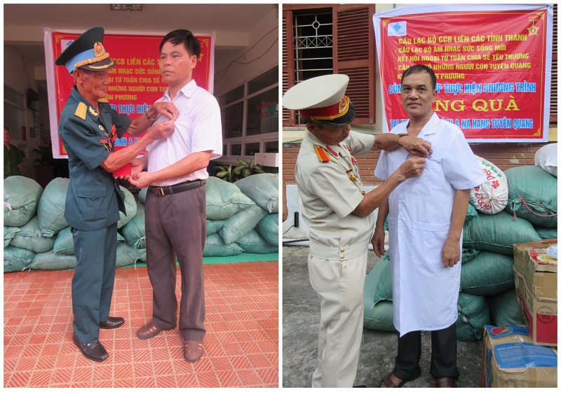 Đại tá Đinh Thế Văn, AHLLVT Chủ tịch CLB gắn Kỷ niệm chương của CLB cho Phó Giám đốc Trung tâm Y tế huyện Lâm Bình (ảnh trước) và Phó Chủ tịch CLB Đinh Công Chất gắn Kỷ niệm chương cho Phó Phụ trách Trung tâm Y tế huyện Na Hang (ảnh sau)