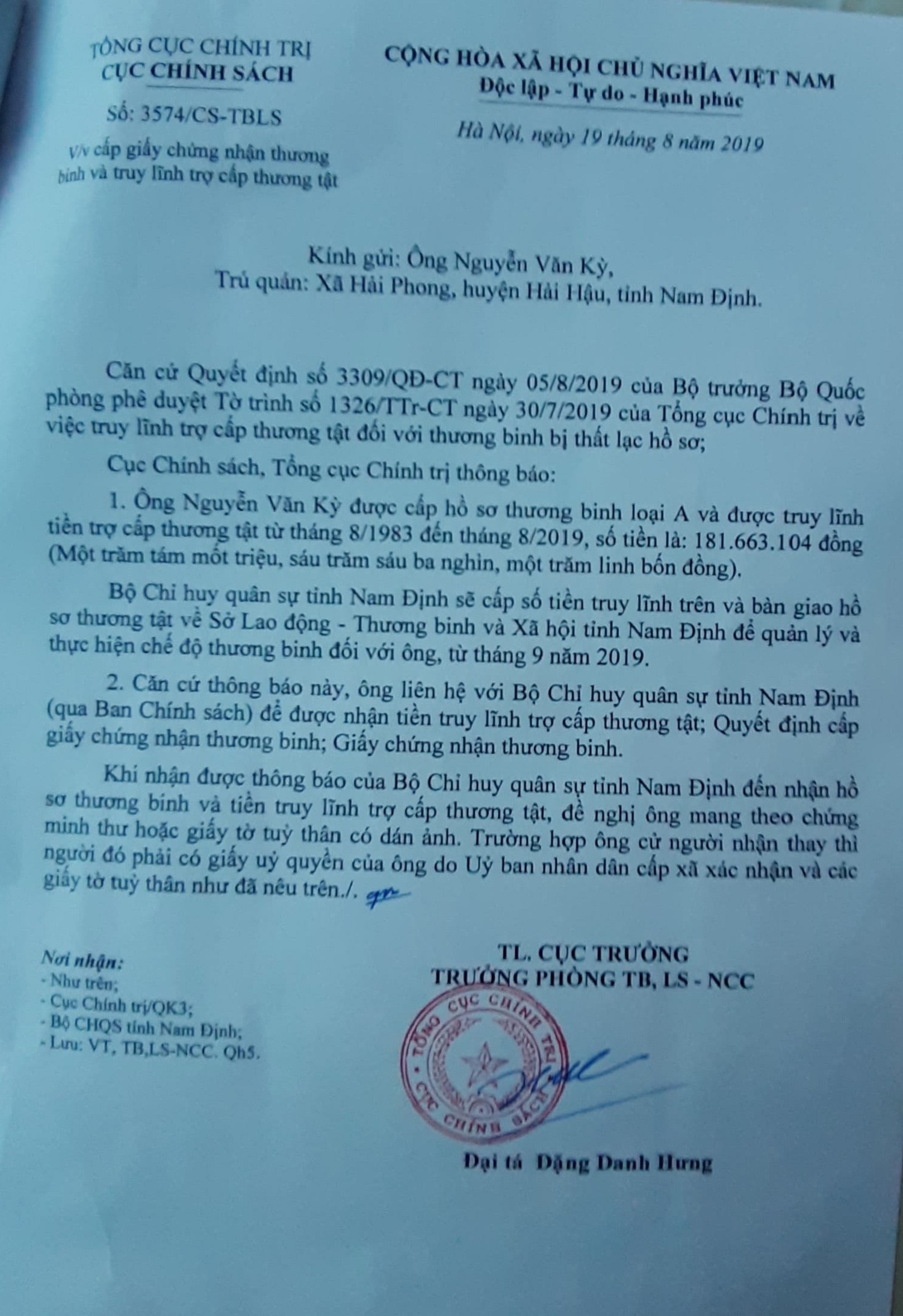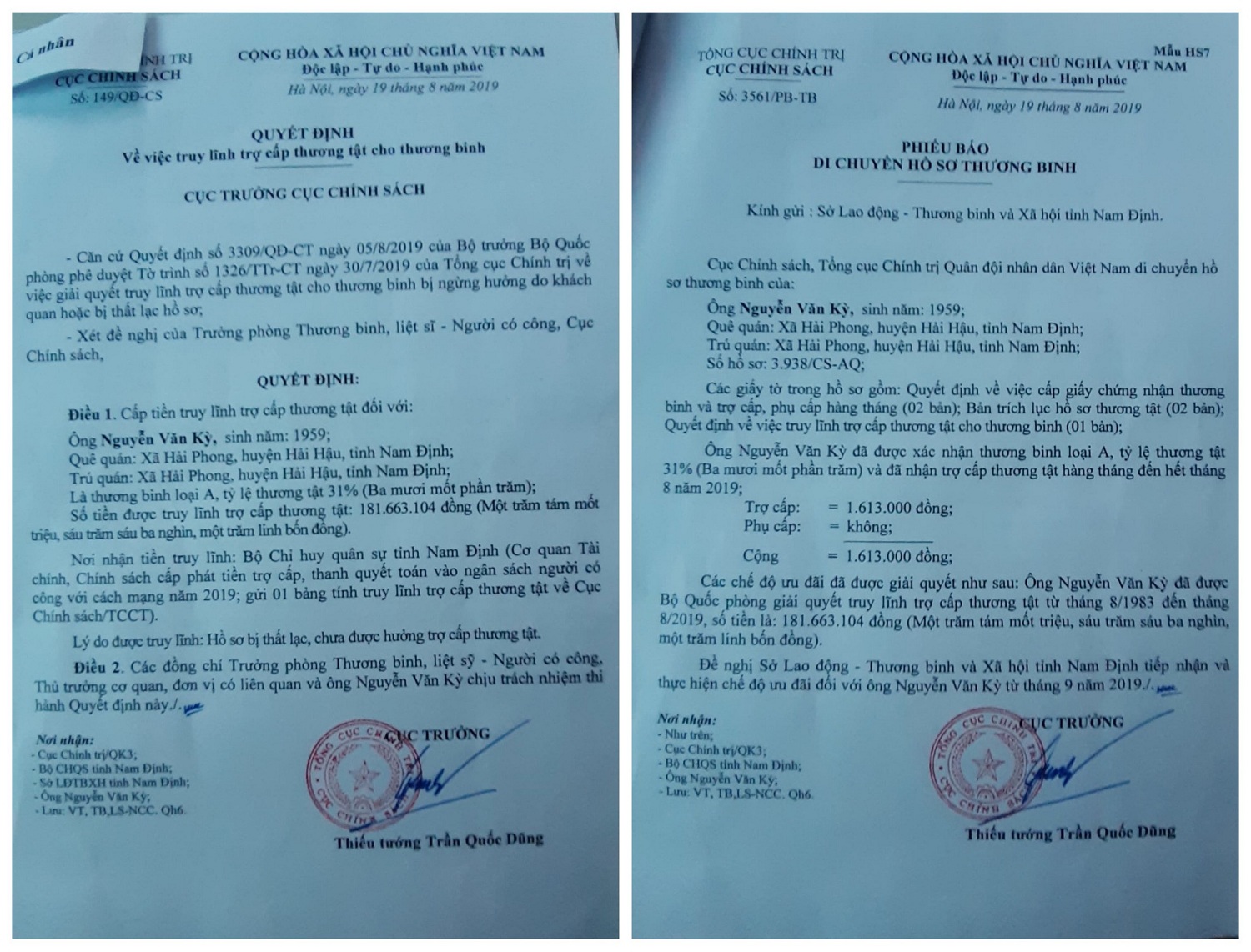 Vừa qua, CCB Nguyễn Văn Kỳ đã nhận được 3 văn bản do Cục Chính sách, Tổng Cục Chính trị ban hành ngày 19/8/2019, gồm: