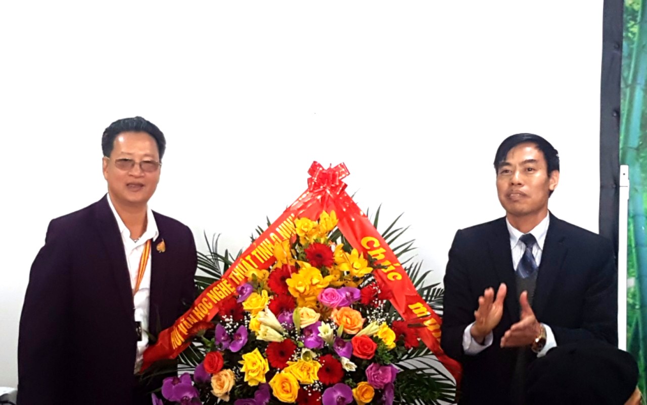 Ông Đào Huy Toàn - Chủ tịch Hội Văn học Nghệ thuật Quảng Ninh tặng hoa chúc mừng Nghệ sĩ nhiếp ảnh Vũ Tiến Dũng (Người đứng bên trái)