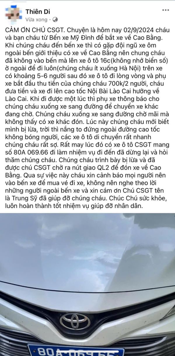 Chủ facebook Thiên Di viết "CẢM ƠN CHÚ CSGT. Chuyện là hôm nay 2/9/2024 cháu và bạn cháu từ Bến xe Mỹ Đình để bắt xe về Cao Bằng. Khi chúng cháu đến bến xe thì có gặp đội ngũ xe ôm ngoài bến giới thiệu có xe về Cao Bằng nên chúng cháu đã không vào bến mà lên xe ô tô 16 chỗ (không nhớ biển số) ở ngoài để đi luôn (chúng cháu ít xuống Hà Nội) trên xe có khoảng 5-6 người sau đó xe ô tô đi lòng vòng và phụ xe bắt đầu thu tiền của chúng cháu 700k/2 người, cháu đưa tiền và xe đi lên cao tốc Nội Bài - Lào Cai hướng về Lào Cai.