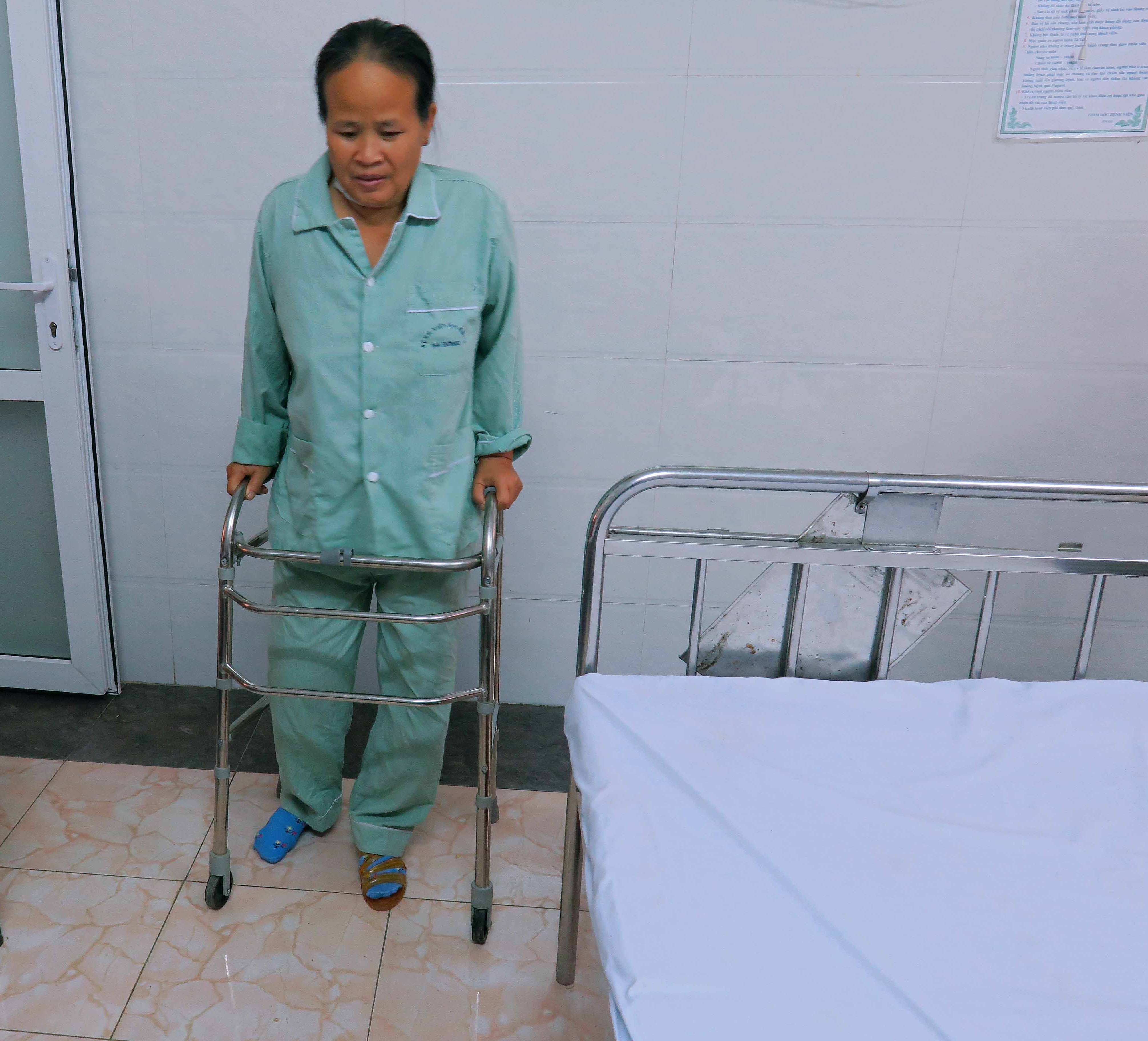 Sau 5 ngày phẫu thuật thay khớp háng toàn phần, bệnh nhân Thảo tập đi và có thể bước đi những bước đi đầu tiền mà không còn bị đau.