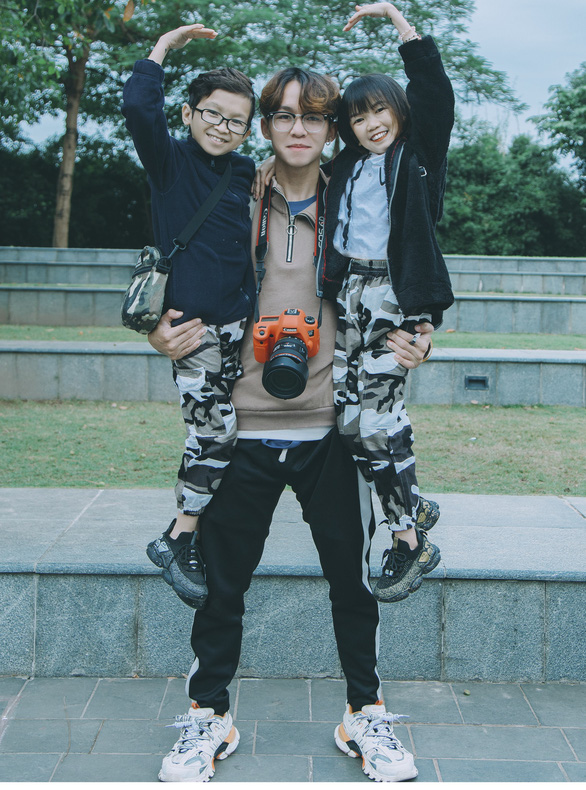 "Nhiếp ảnh gia" Trần Văn Trà chụp hình với vợ chồng thầy giáo tí hon - Ảnh: T.TRẦN