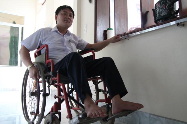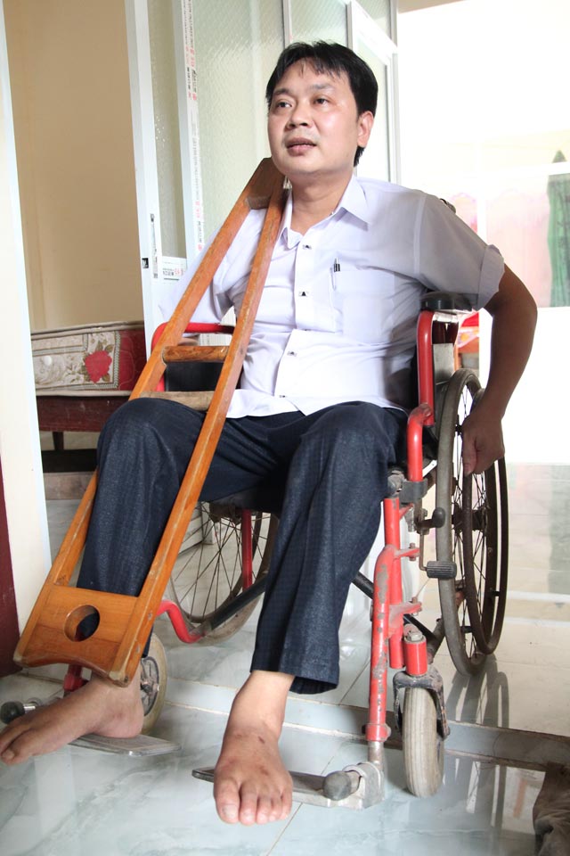 | Sau vụ tai nạn, chân anh Hậu bị liệt và 17 năm nay anh phải gắn cuộc đời với chiếc xe lăn, cùng chiếc nạng gỗ. |