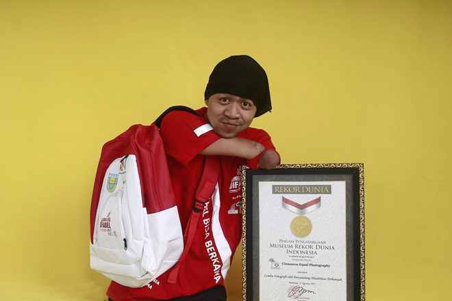Achamad Zulkarnain bị khuyết tật bẩm sinh do không có bàn tay nên chàng trai 24 tuổi này đã dùng miệng, mặt và cánh tay để điều khiển máy ảnh.