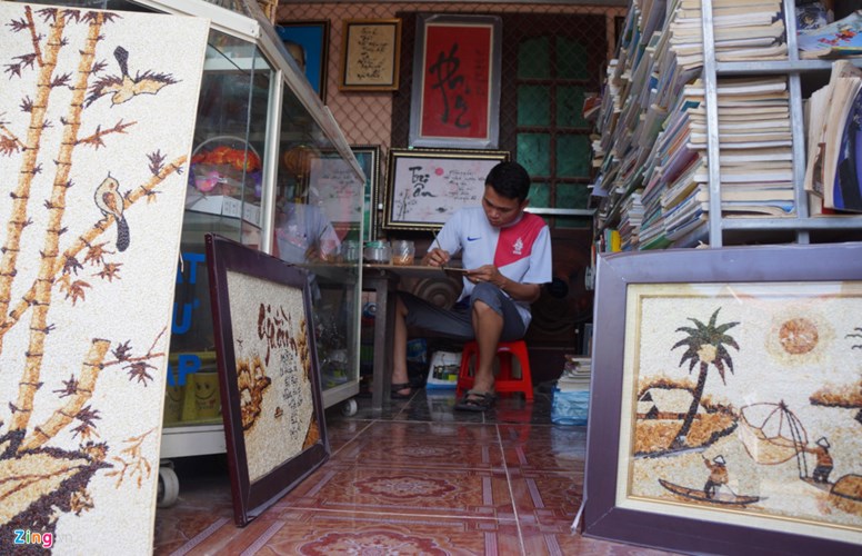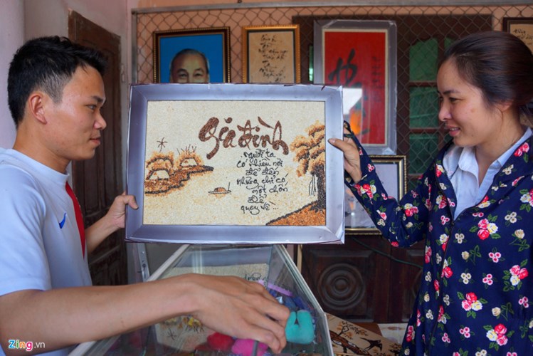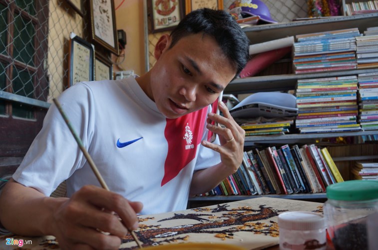 Mỗi ngày, anh thường xuyên tất bật với công việc ở cơ sở tranh. Anh vừa làm, vừa phải liên tục nghe điện thoại của khách gọi đến đặt hàng. Có thời điểm, anh không làm kịp tranh để bán, nhất là vào dịp lễ Tết. Công việc này hiện mang lại cho anh nguồn thu nhập ổn định hàng tháng.
