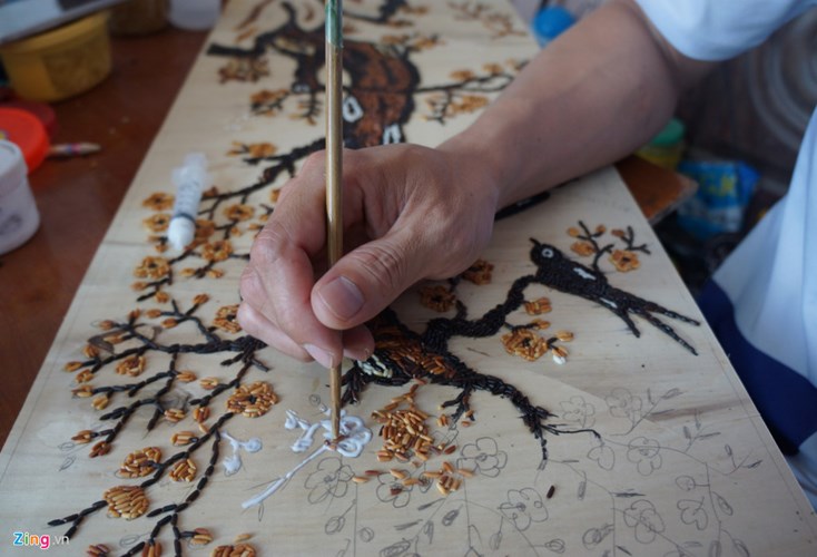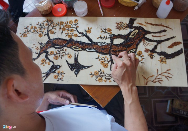 Nói về cơ duyên với nghề, anh Cao Văn Tuân kể cách đây 6 năm, trong lần sinh nhật tuổi 24 của mình, anh được một người bạn tặng một tấm tranh gạo. "Lúc ấy, mình rất ngạc nhiên và thích thú. Bởi bức tranh rất đẹp, lại được làm bằng những hạt gạo thân thuộc, gần gũi. Trong đầu mình lóe lên ý tưởng sẽ học vẽ tranh gạo bằng được", anh nhớ lại.